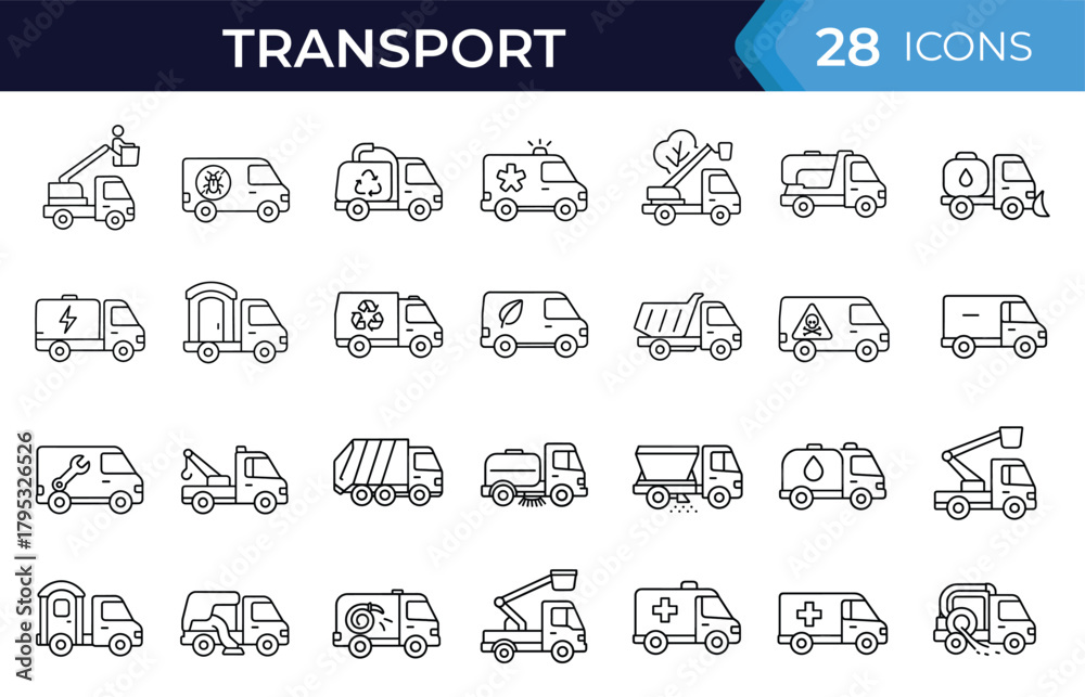 Public service municipal vehicle line icon set. Vector symbols of utility trucks, emergency units, maintenance, cleaning, repair, rescue thin linear illustration #1795326526