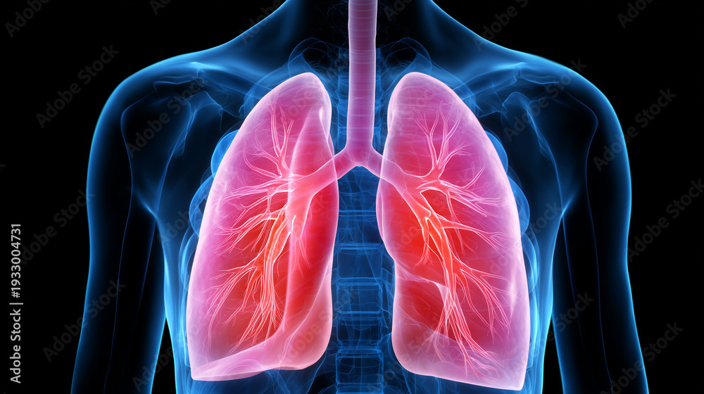 Pulmões humanos representados digitalmente destacando sistema respiratório, troca de oxigênio e funcionamento vital do corpo humano. #1933004731