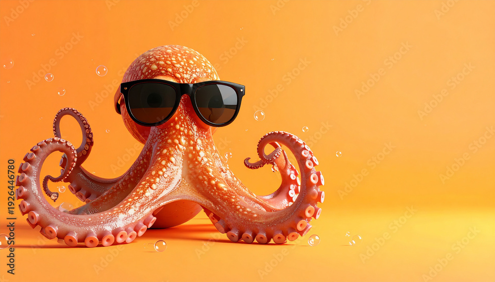 pulpo naranja con gafas de sol negras con fondo d estudio anaranjado cone espacio vacio #1926446780