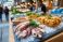 Pulpo y platos preparados con mariscos se muestran sobre hielo en un mercado exterior con ambiente animado. #1910720190