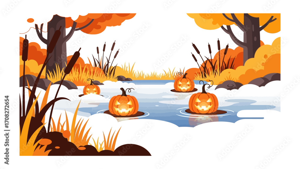 Pumpkin on Pond: A stylized illustration showcases floating, grinning pumpkins in a serene pond scene with autumn foliage, invoking the spirit of Halloween. #1708272654