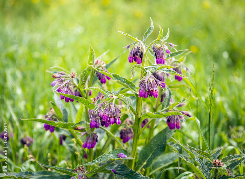 Purple budding, flowering and overblown blooms of a common comfrey plant #153192914