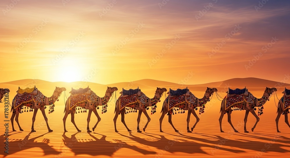 Pushkar Camel Festival gradient banner from desert gold to burnt orange, camels decorated with colorful tassels and mirrors walking under sunset #1783371627