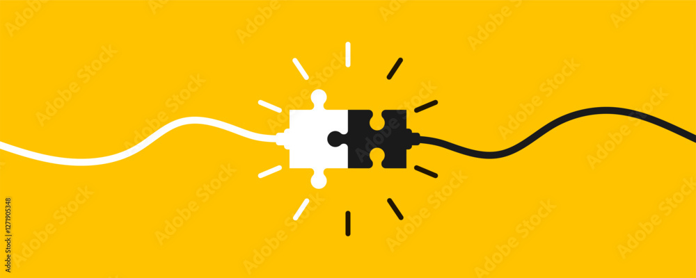 Puzzle pieces connected together. Two puzzle pieces with cables coming together on yellow background. Problem solving concept, business solutions and ideas. Vector. #1271905348