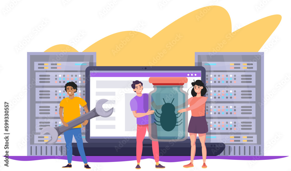 QA, quality assurance concept. Software testing illustration. Testers found a bug. Developer programmer with a screwdriver. QA engineer looking for mistakes defects in code. Flat vector illustration. #599330557