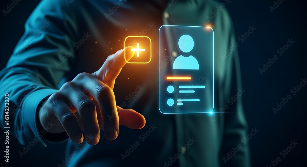 QFS favorite contact concept. Hand adds a contact to a favorites list on a holographic interface for quick Quantum Financial System transactions. #1614272270