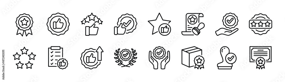 Quality control thin line icon set. Containing value, star, thumb up, premium, review, rate, award, best, favorite, good, certification, evaluation, stamp, satisfaction, service, support. Vector #1472403011