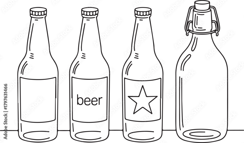 Quartet of Outline Beer Bottles with Labels and Stopper on an Abstract Landscape #1797631466
