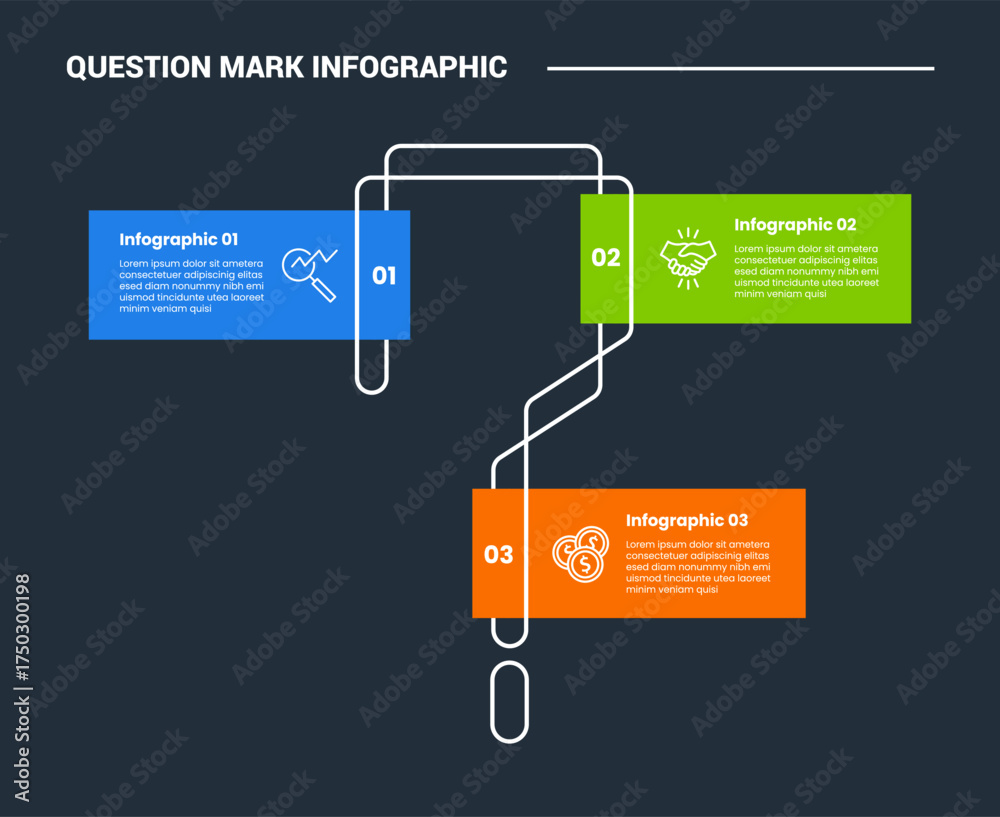 Question mark infographic process diagram with creative flip line with rectangle box alongside shape with dark background bright outline style 3 points #1750300198