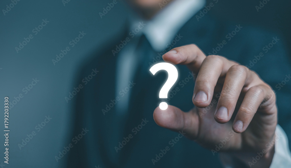question mark shows on a laptop. concept of ask, answer, Business FAQ, Thinking, and wondering. question tech Brainstorming and problem-solving #1792203330