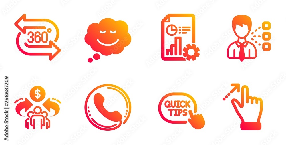 Quick tips, Sharing economy and Speech bubble line icons set. Third party, Report and Call center signs. 360 degree, Touchscreen gesture symbols. Helpful tricks, Share. Technology set. Vector #298687209