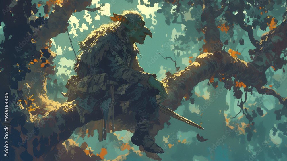 quiet goblin resting high on a thick tree branch in a magical forest, surrounded by soft light filtering through the leaves #986163305