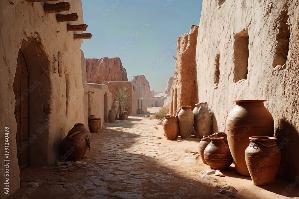 Quiet traditional lane with adobe walls, palm fronds and clay vessels; warm daylight and soft dust create a timeless feel. #1791240478