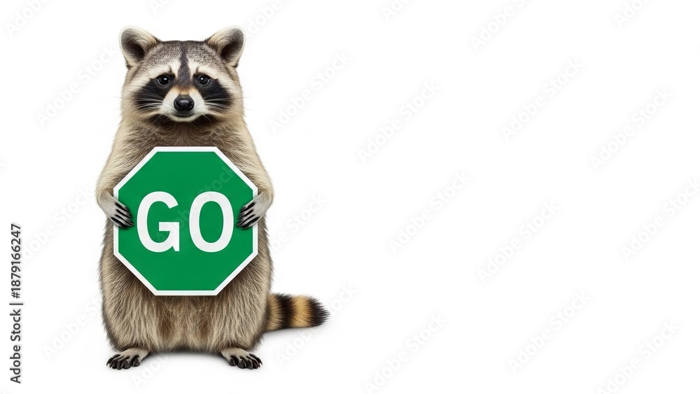 raccoon holding a green go sign, road sign, on a white background, animal graphic #1879166247