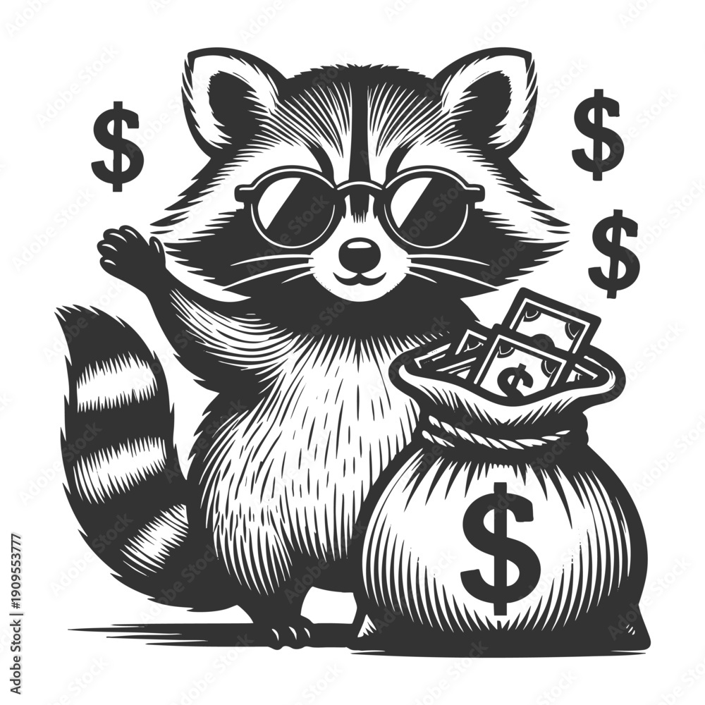 raccoon in sunglasses standing next to a cash-filled money bag, symbolizing wealth and mischief sketch engraving generative ai vector illustration. Scratch board imitation. Black and white image. #1909553777