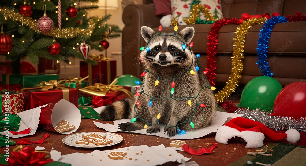 Raccoon sitting among Christmas decorations and gifts with lights #1781089768
