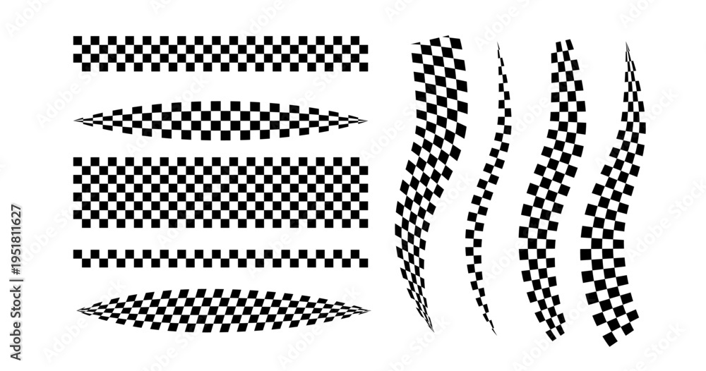 Race flag lines. Black and white checker finish ribbon. Car race grid pattern. Rally border texture. Wavy checker lines. Chess graphic design element. Vector illustration isolated on white background. #1951811627