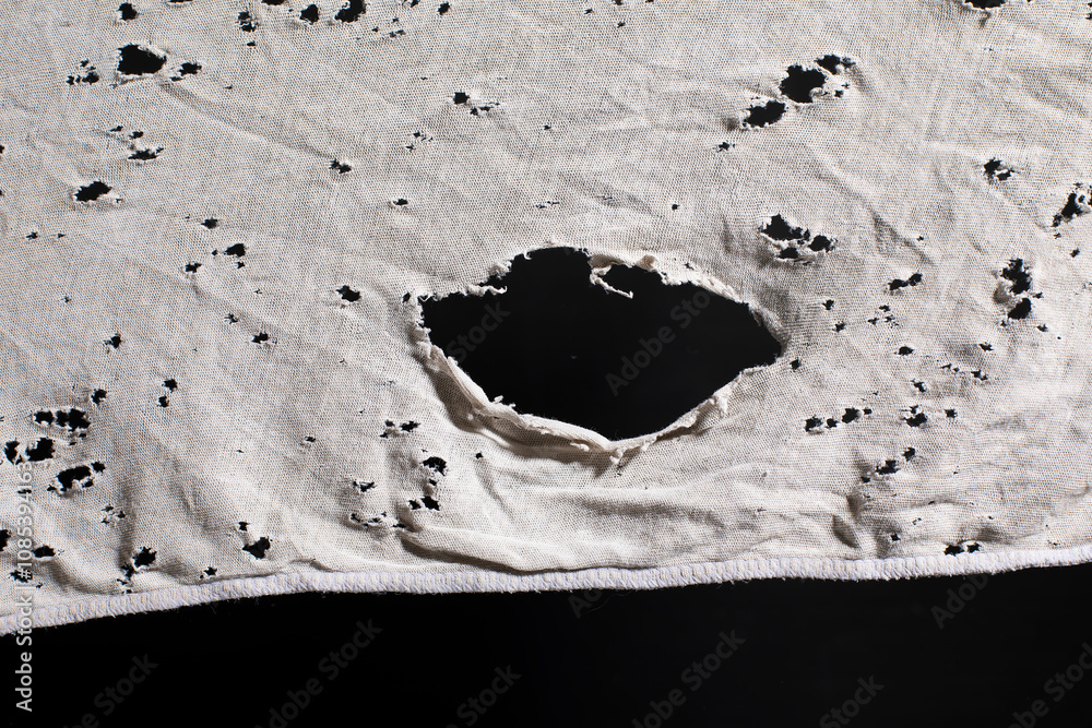 Ragged cloth with holes, grunge damaged white shirt on black background, ripped white fabric with many holes #1085394163