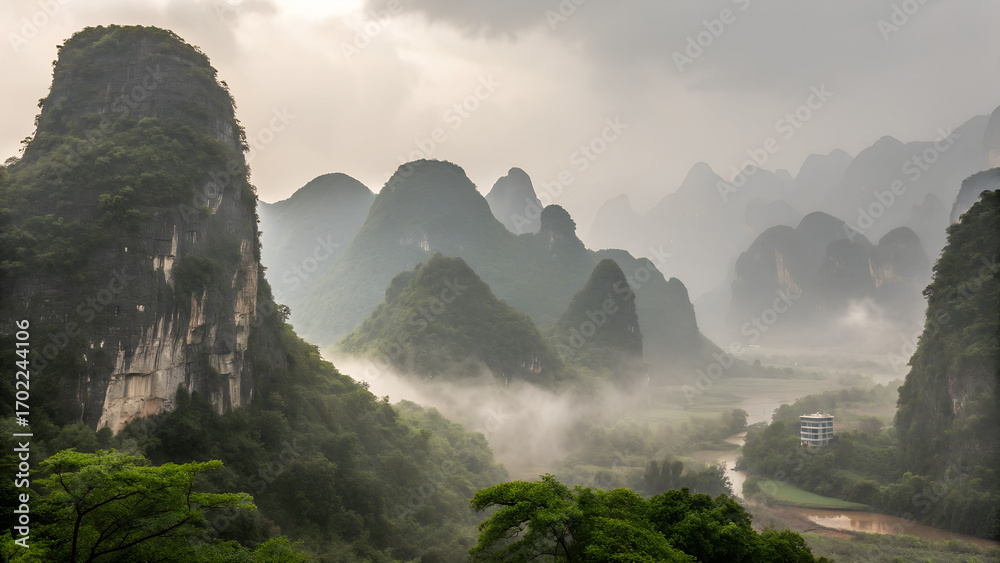 Rain-soaked Limestone Karst Hills – Towering cliffs in mist and drizzle #1702244106