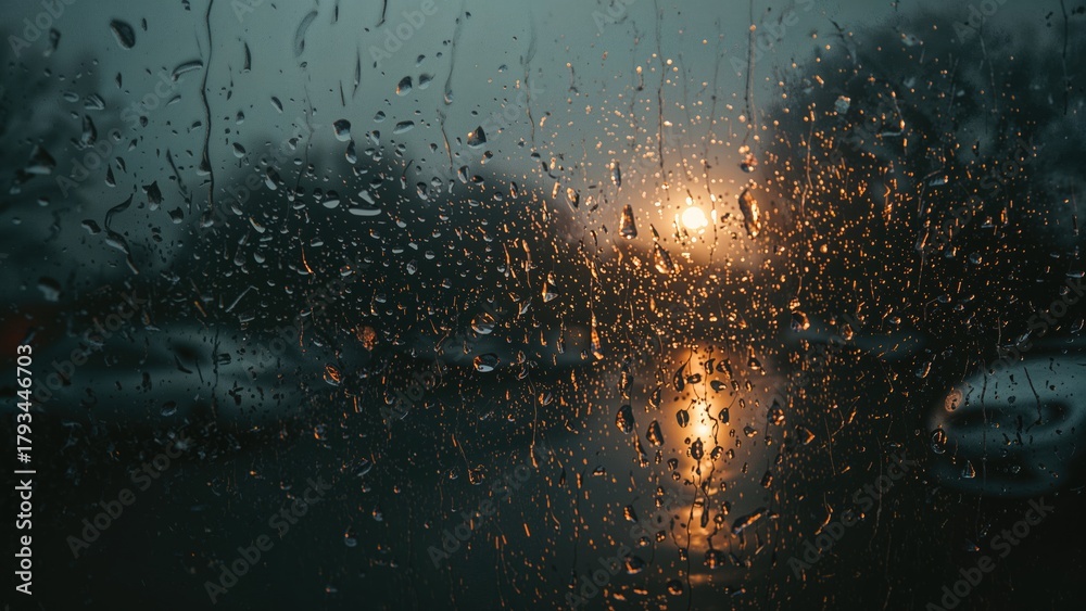 Rainy weather seen through a car window with water droplets and a sunset glow. Transportation and weather, concept. Weather conditions and driving safety. The concept of rain and weather impact. #1793446703