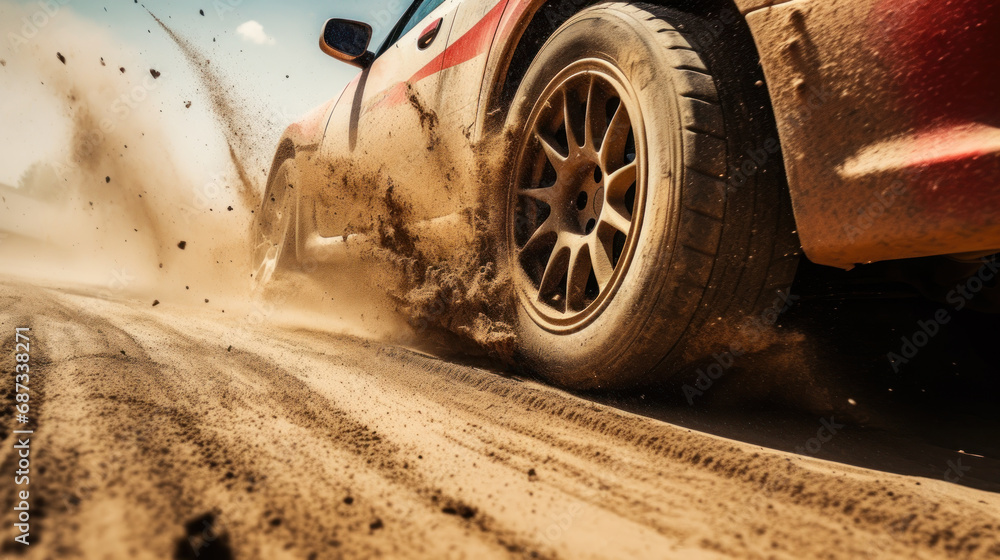 rally competition, dust from under the wheels of a sports car generative ai #687338271