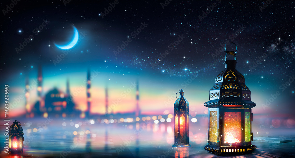 Ramadan Kareem - Arabic Lanterns With Crescent Moon - Eid Ul Fitr - Defocused Mosque At Night With Abstract Glittering In The Air And Bokeh Lights #1920320990