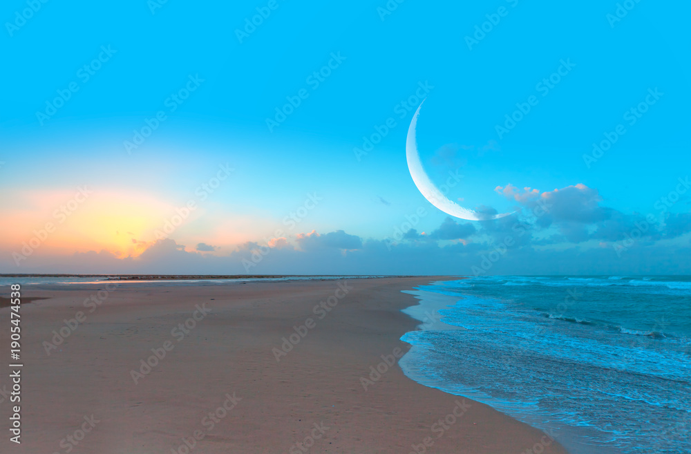 Ramadan Kareem background - Abstract background of amazing crescent moon over the sea at sunset #1905474538