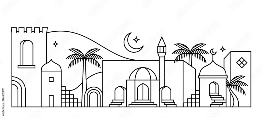 Ramadan Kareem background in white and black line art style. Modern linear Islamic greeting card template and wallpaper design. Poster and media banner vector illustration #1976850119
