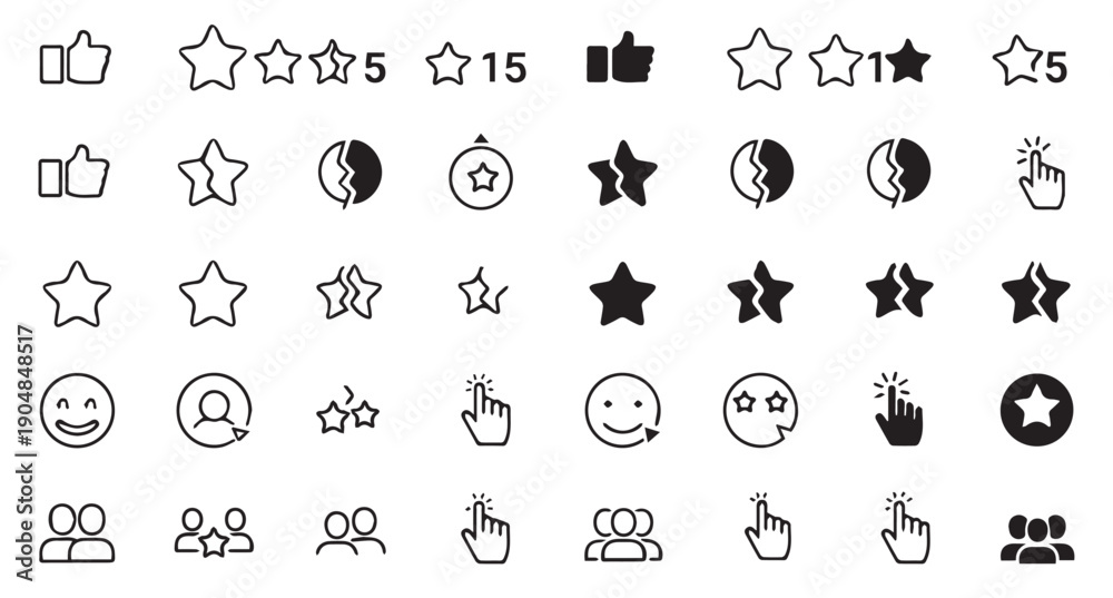 Rating and Feedback Icon Set with Stars, Thumbs Up, Smileys, and User Review Symbols for UI UX Design #1904848517