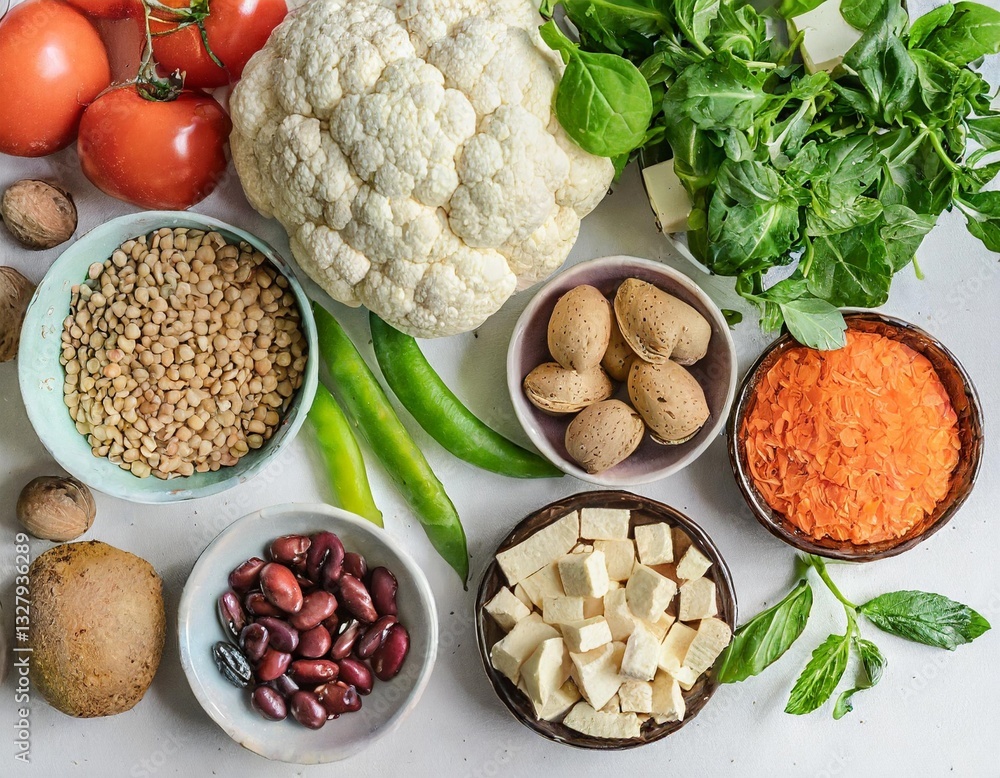 Raw Ingredients for Whole Food Plant-Based Diet – Fruits, Vegetables, Grains, Legumes, Tofu, and Nuts for Clean Eating Blogs #1327936289