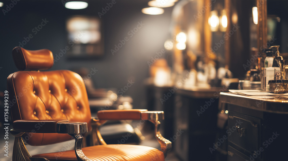 razor. A vintage barbershop chair reflects in a warm and elegant interior with classic grooming ambiance. lifestyle magazines. #1758299239