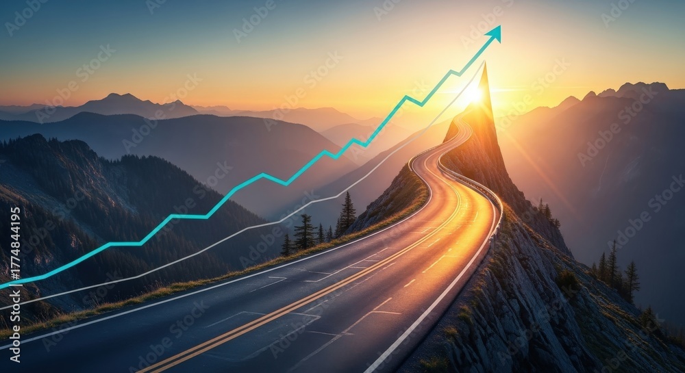 Reach new heights with this stunning upward trend, perfect for showcasing business growth and ambitious goals on a winding mountain road at sunset #1774844195