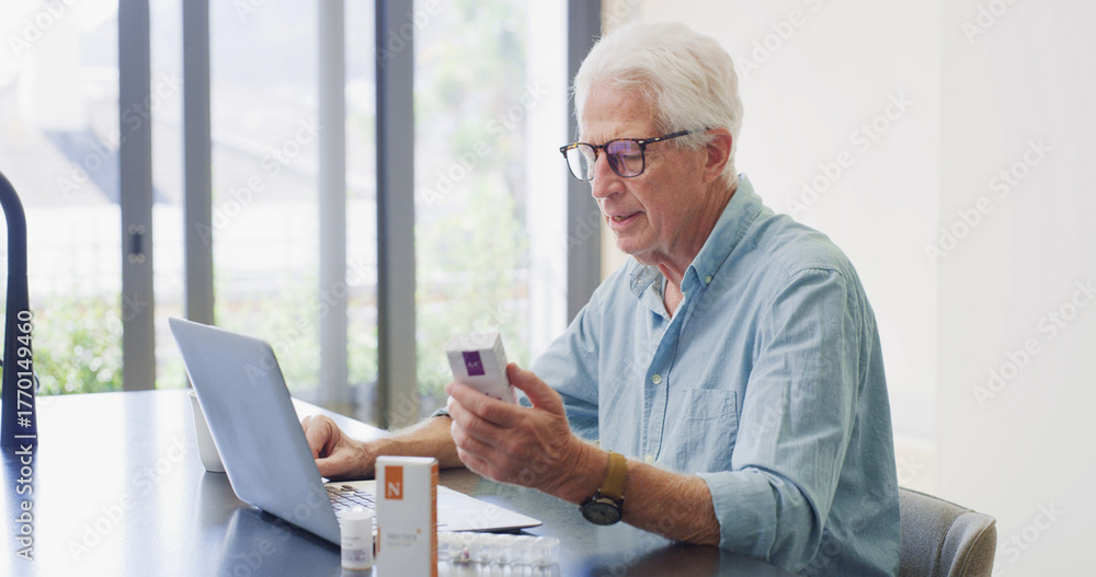 Reading, pills and laptop with old man in home for dosage instruction, medicine and side effects. Research, online pharmacy and medical information with senior person in apartment for prescription #1770149460