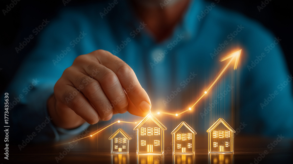 Real Estate Investment Ascent: Conceptual image depicts a person pointing towards a glowing line, which symbolizes growth above miniature house representations. #1773435630