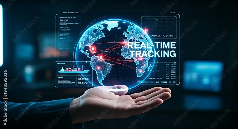 Real-time cargo tracking. A hand over a holographic world map, tracking the exact location of a cargo ship with "REAL-TIME TRACKING" text. #1948595036