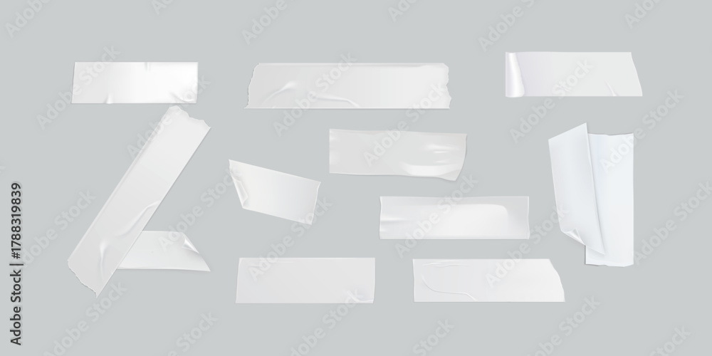 Realistic adhesive tape pieces collection vector illustration isolated on white background, transparent sticky scotch tape mockup set for office, packaging, repair, notes or decoration projects. #1788319839