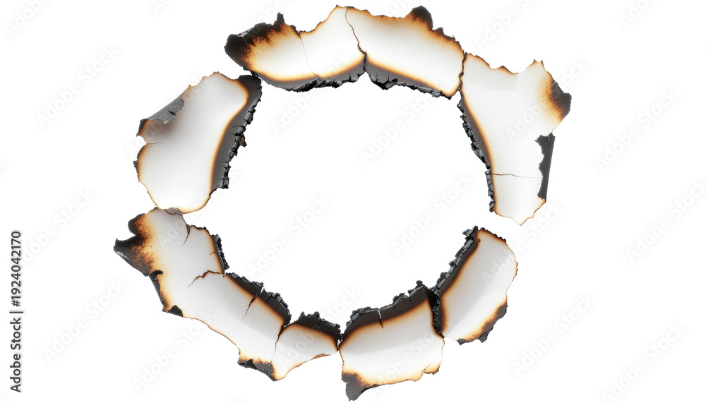 Realistic burned paper hole with charred edges and torn texture, dramatic fire damage effect isolated on white background #1924042170