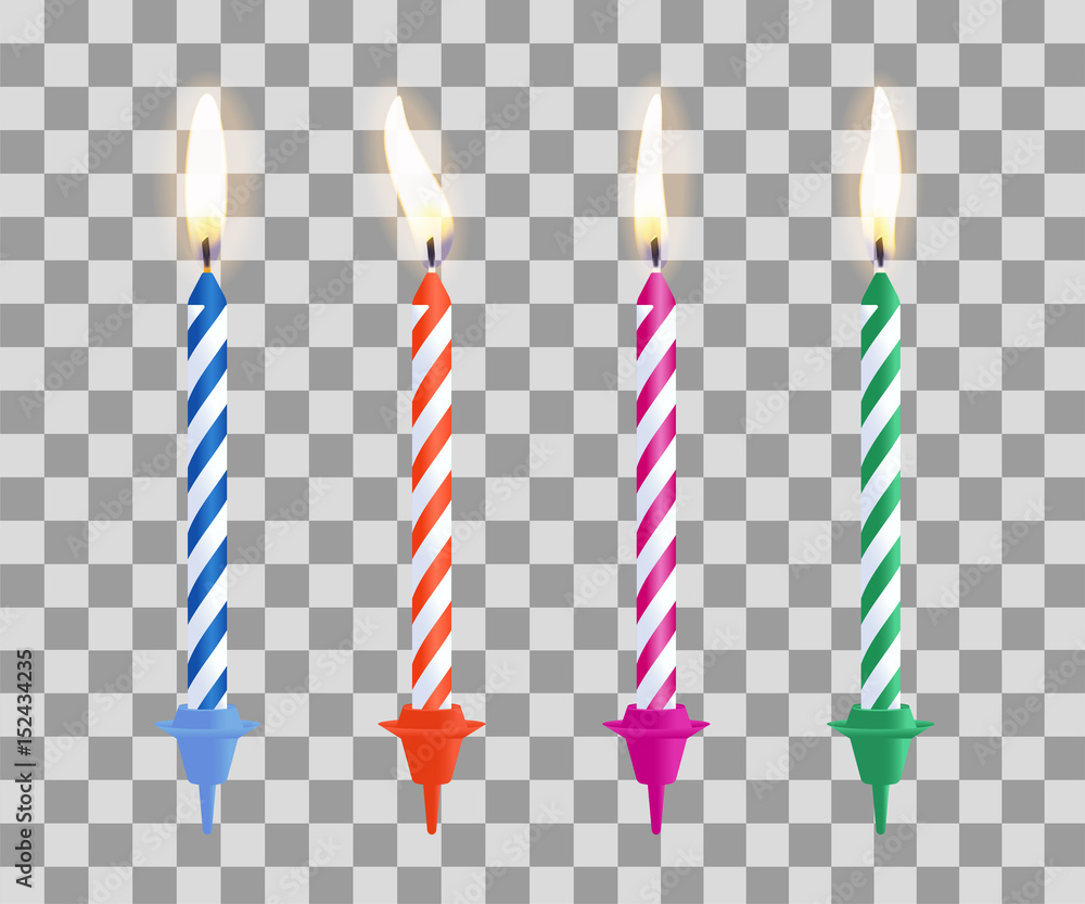 Realistic burning birthday cake candles set isolated on transparent checkered background. Vector illustration. #152434235