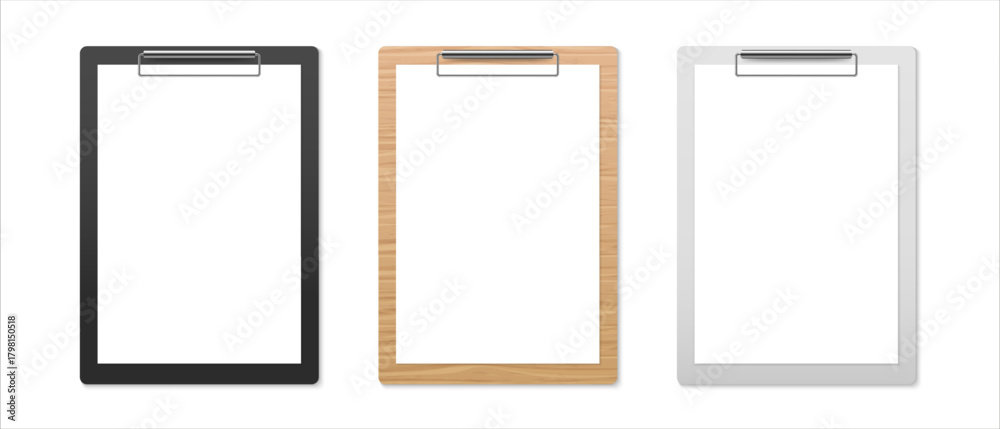 Realistic clipboard mockup set. Office folder. Notepad information board. Paper on black, wood and gray board with holder. Vector illustration #1798150518