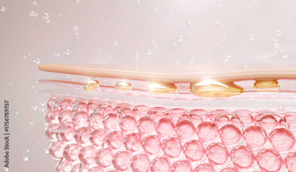 Realistic 3D skin anatomy with transparent serum bubbles beneath the surface. Ideal for cosmetic, hydration, or skin rejuvenation projects. #1756789757