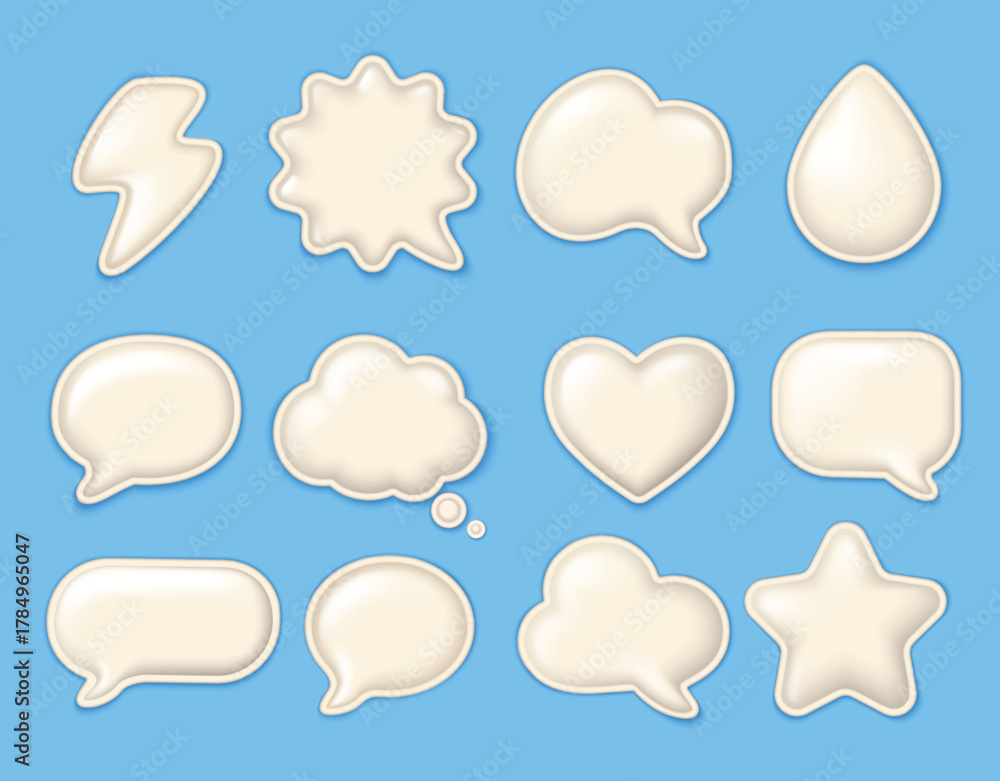Realistic 3D white puffy glossy stickers with soft creamy texture on blue background. #1784965047