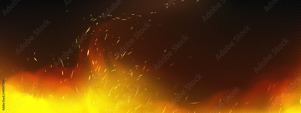 Realistic fire with smoke and weld sparks, flame isolated on transparent background. Burning campfire, blaze effect, glow orange and yellow shining flare with steam, 3d vector illustration, mock up #409875641