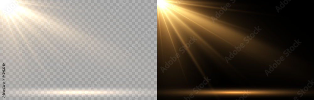 Realistic golden lens flare light effect with bright starburst and glowing rays. Sparkle flash and radiant sunlight glow isolated on transparent and black background. Perfect for overlays, visual effe #1942082080