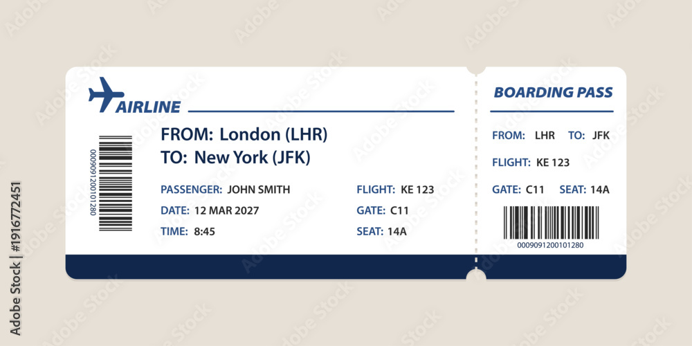 • #1916772451 Realistic illustration of airplane ticket boarding pass with passenger name and destination. Concept of travel, journey or business trip.
