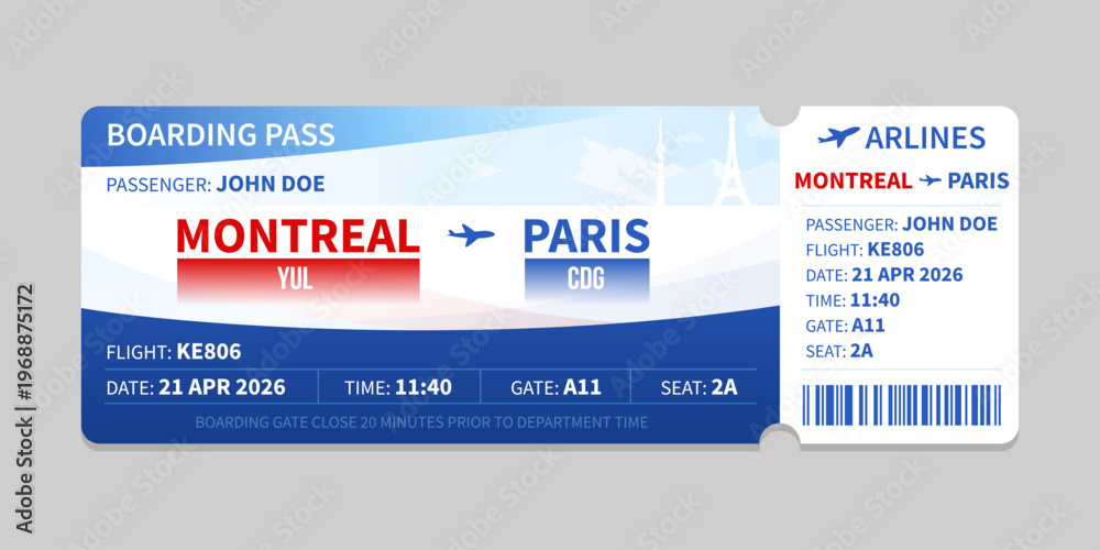 Realistic illustration of airplane ticket boarding pass with passenger name and destination. Concept of travel, journey or business trip. #1968875172