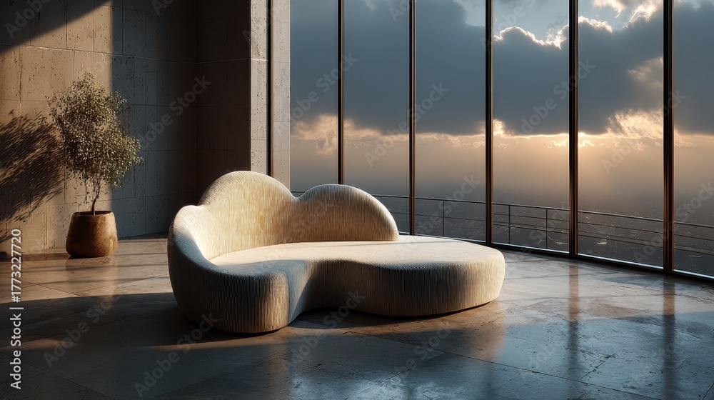 Realistic overhead shot of a cozy cloud couch furniture piece in light gray corduroy fabric sitting low to a polished concrete floor in a modern studio apartment conveying minimalist home decor and ul #1773227720