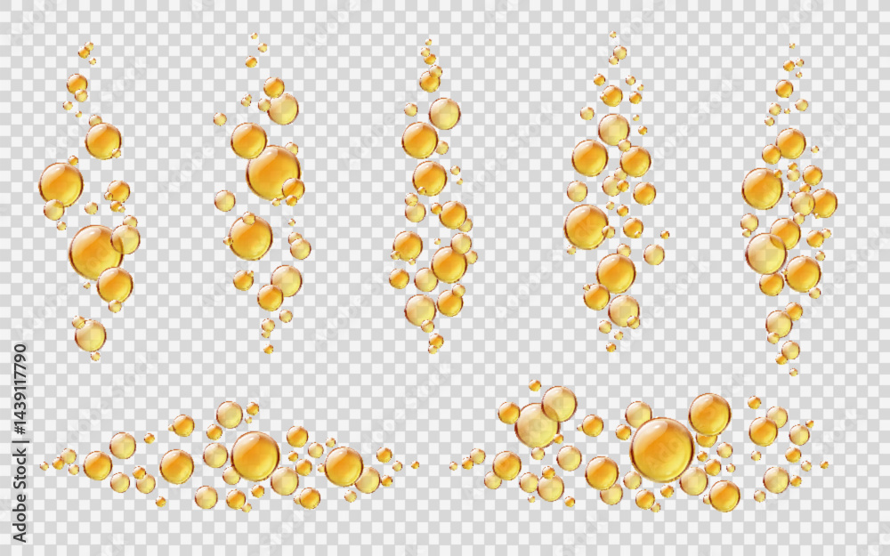 Realistic serum collagen yellow oil bubbles. Isolated 3d vector shiny drops with gold liquid, cosmetic pills or capsules. Oily vitamin essence fizzing droplets, balls set flying or floating in the air #1439117790