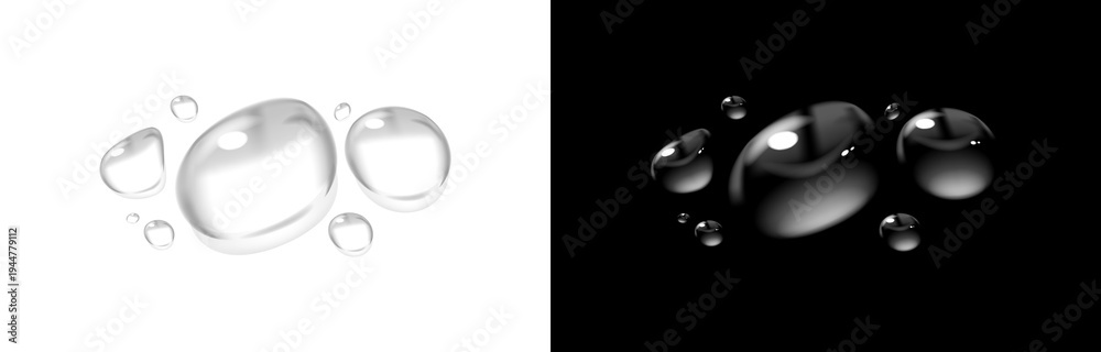 Realistic transparent water drops isolated on transparent and black background. Glossy liquid droplets with reflections and refraction. Perfect for freshness, humidity, condensation effects and design #1944779112