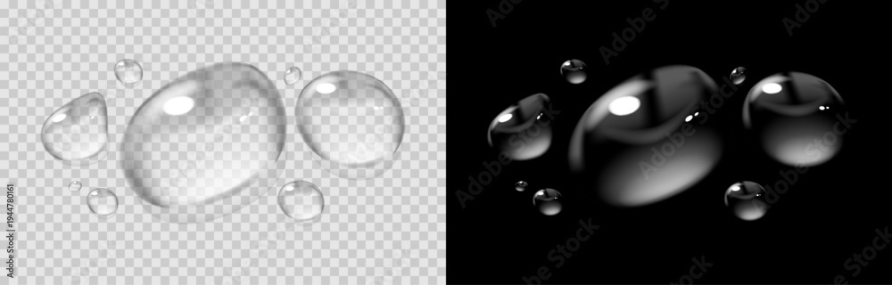 Realistic transparent water drops isolated on transparent and black background. Glossy liquid droplets with reflections and refraction. Perfect for freshness, humidity, condensation effects and design #1944780161