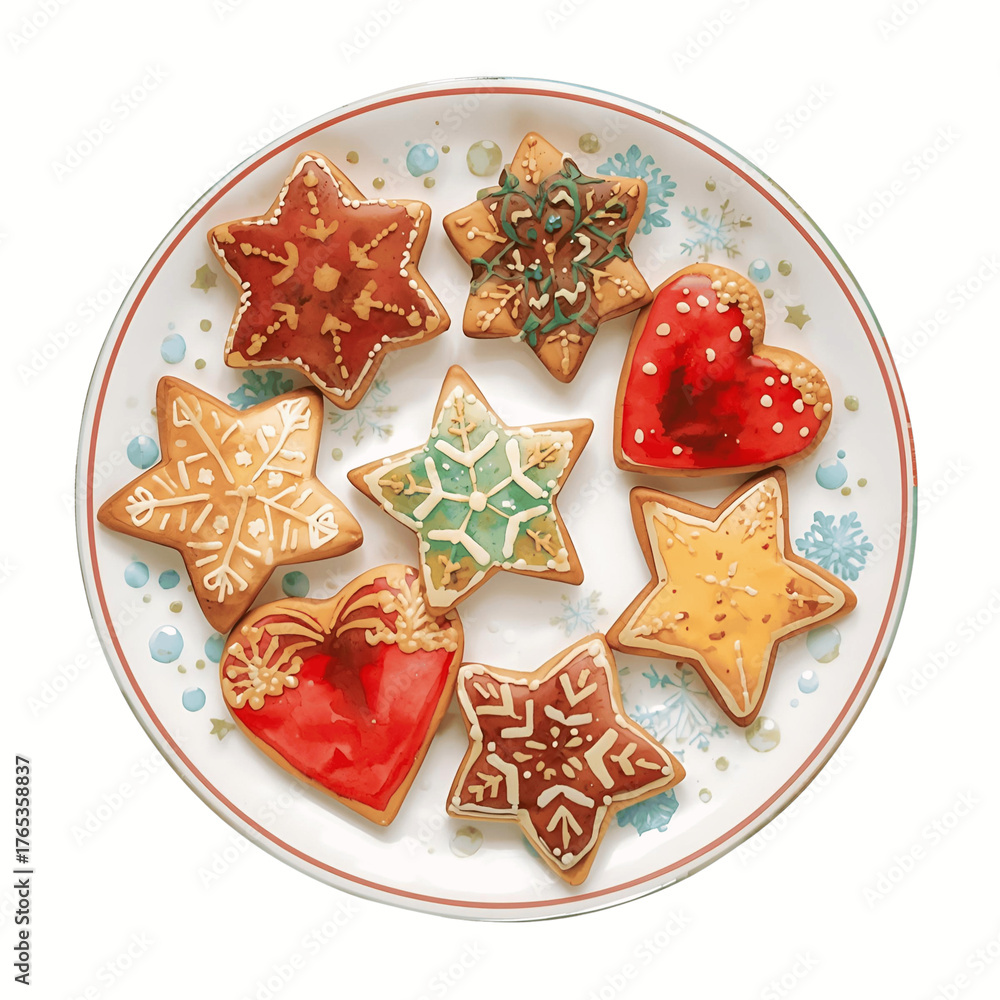 Realistic watercolor plate of Christmas cookies shaped as stars hearts and snowflakes isolated on white background #1765358837